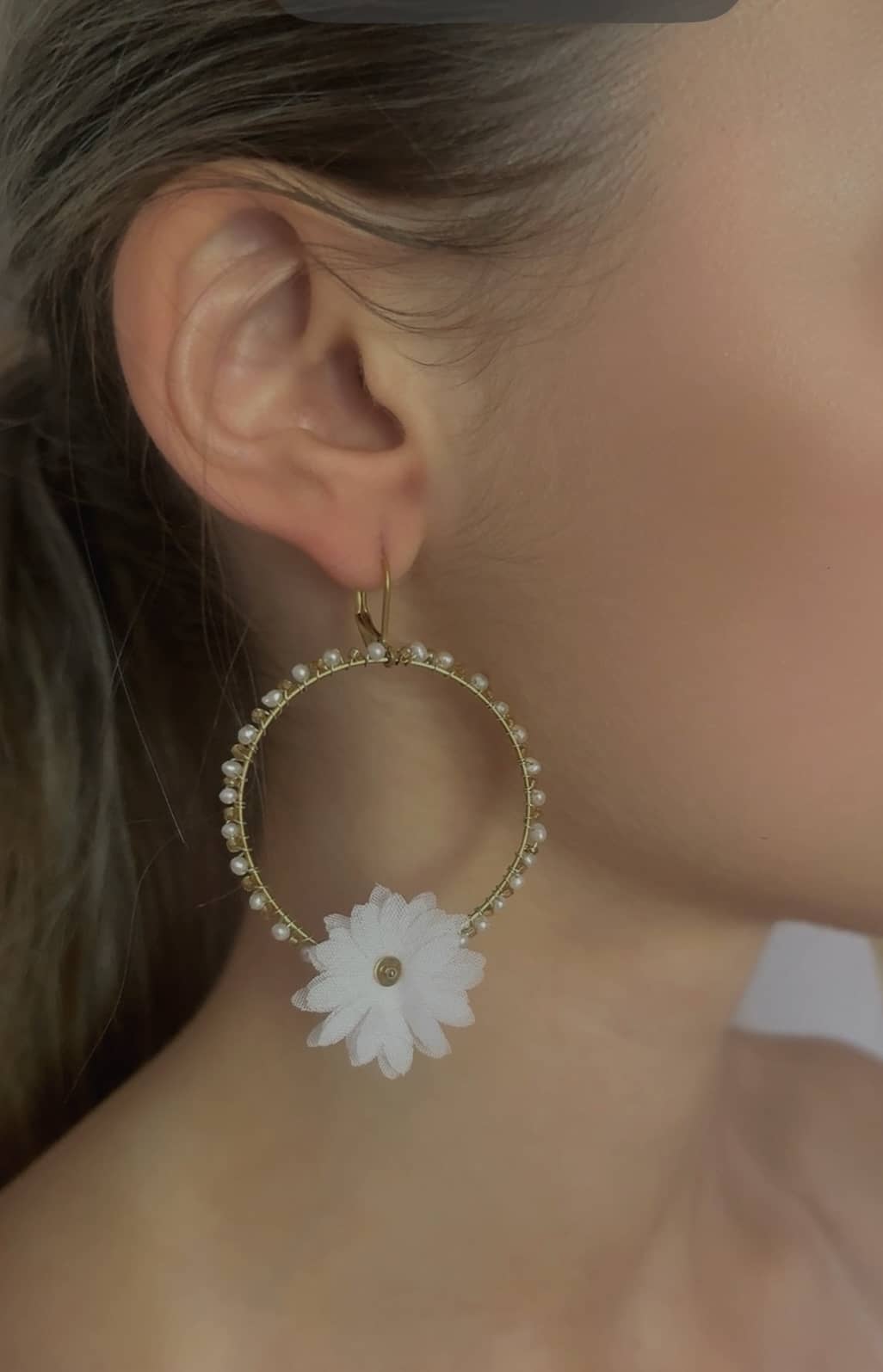 Dormeuse acier sur créole de 45 mm perlée blanc nacré et fleur organza