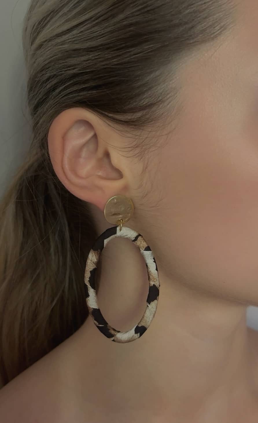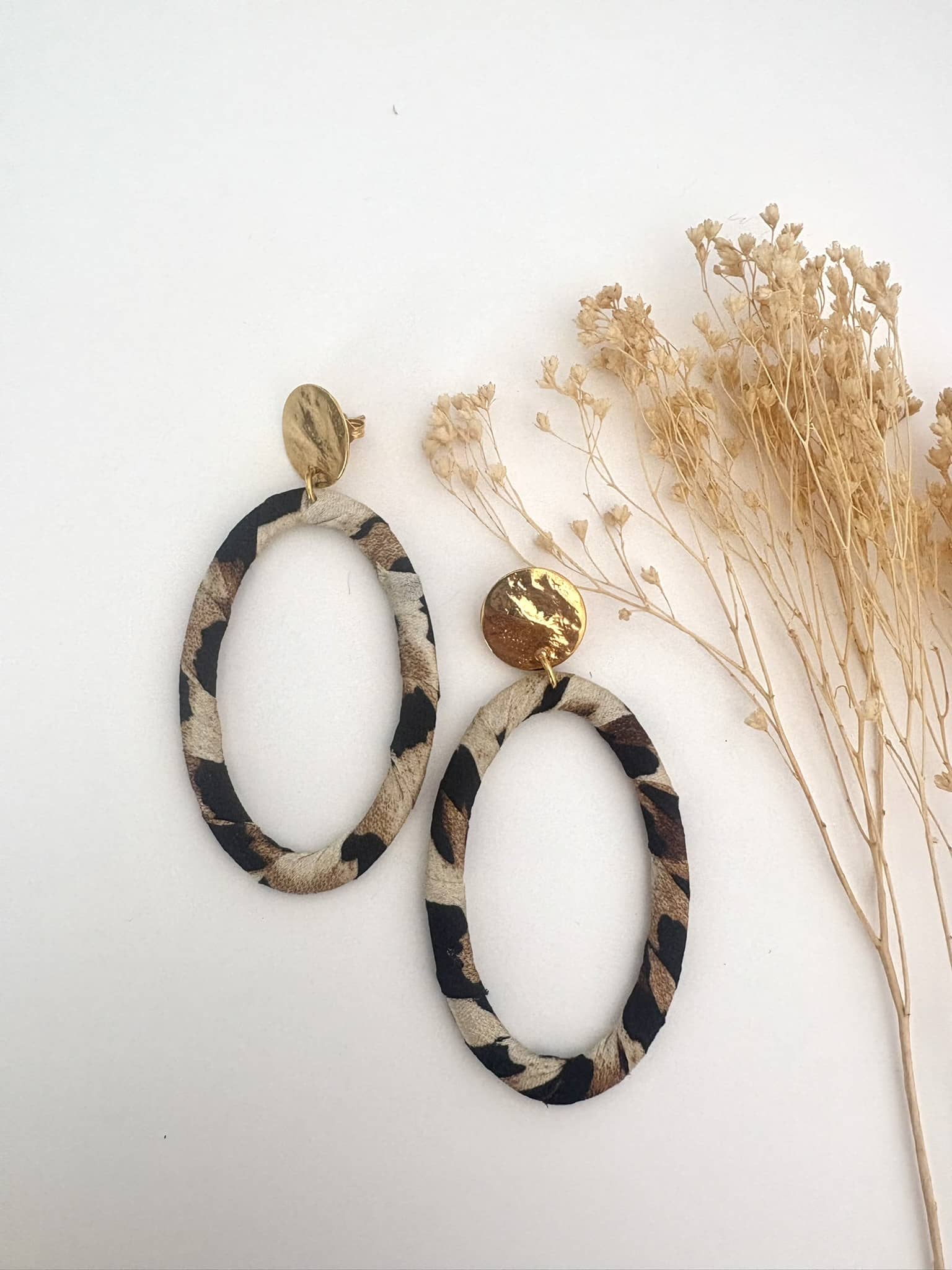 Clou disque martelé doré à l'or fin cercle ovale entouré de tissu soyeux léopard - sans plomb sans nickel - très légères