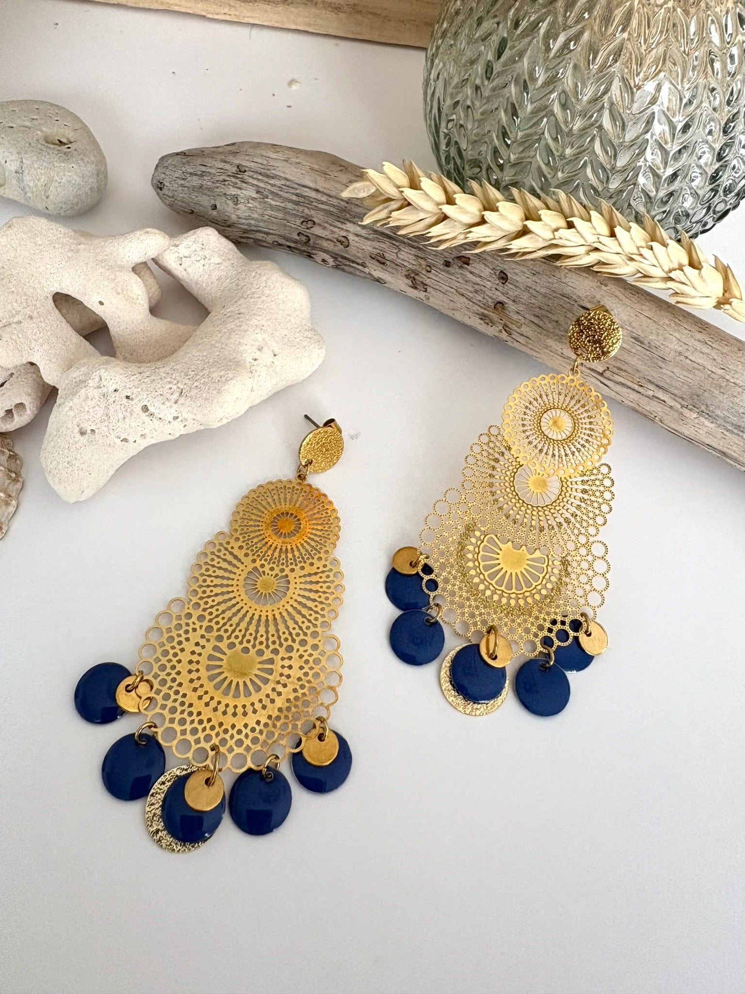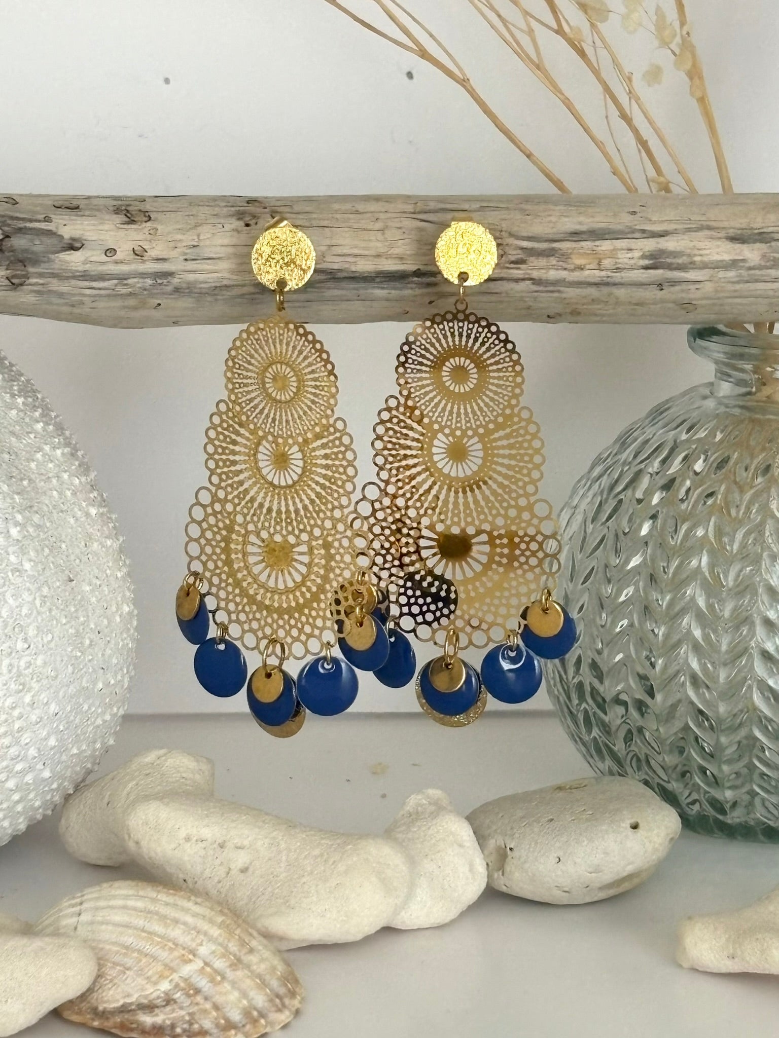 Boucle d'oreilles clou diamanté acier inoxydable , pendentif Mandala laser cut doré en acier, sequins bleu violine et acier