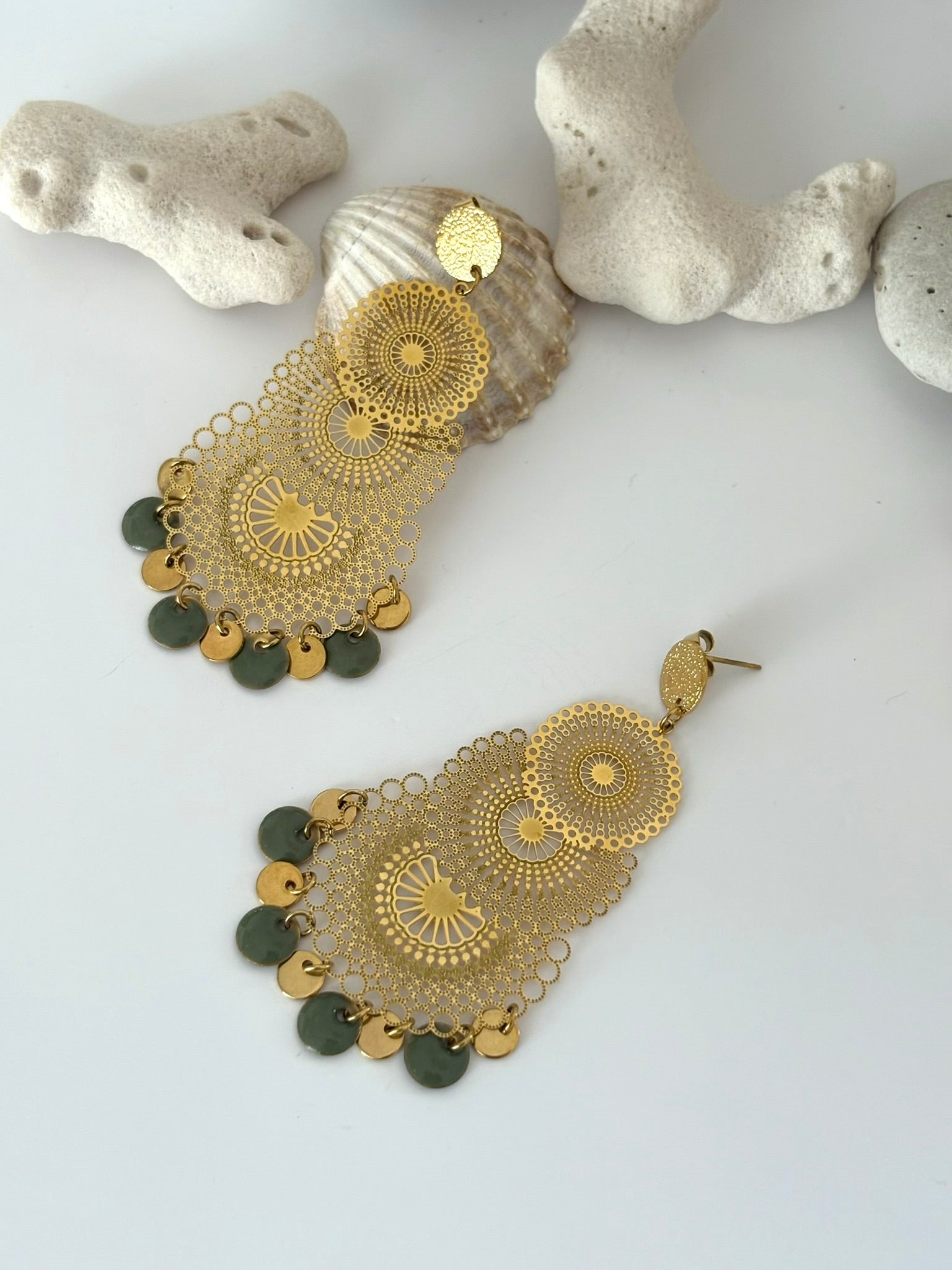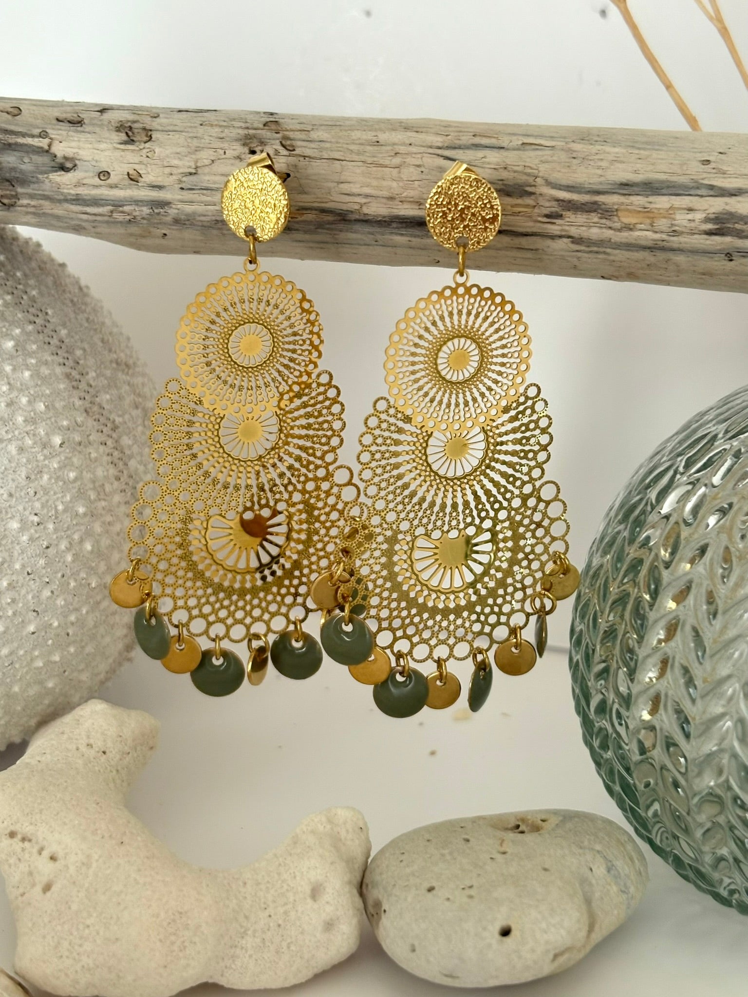 Boucle d'oreilles clou diamanté acier inoxydable , pendentif Mandala laser cut doré en acier, sequins kaki et acier