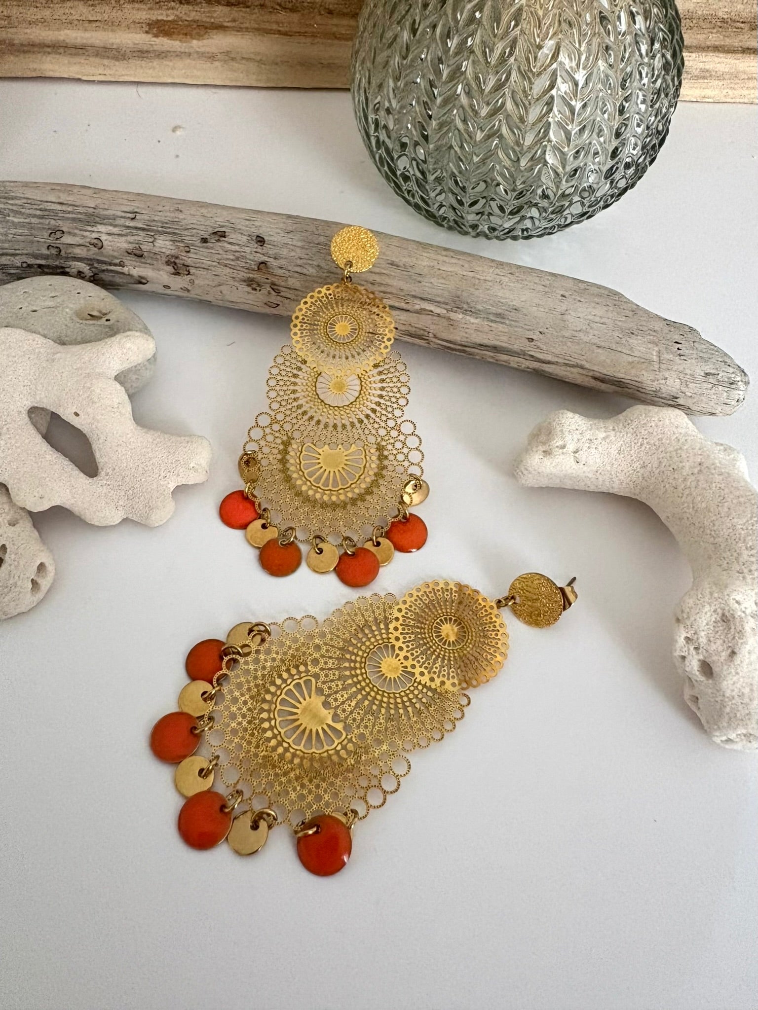 Boucle d'oreilles clou diamanté acier inoxydable , pendentif Mandala laser cut doré en acier, sequins orange et acier