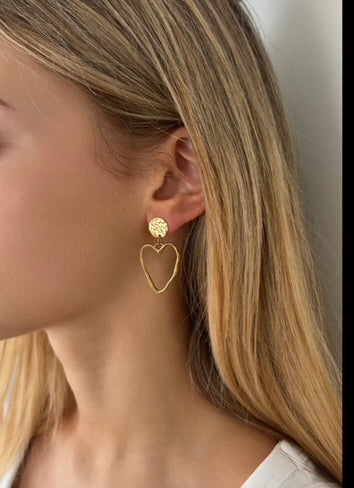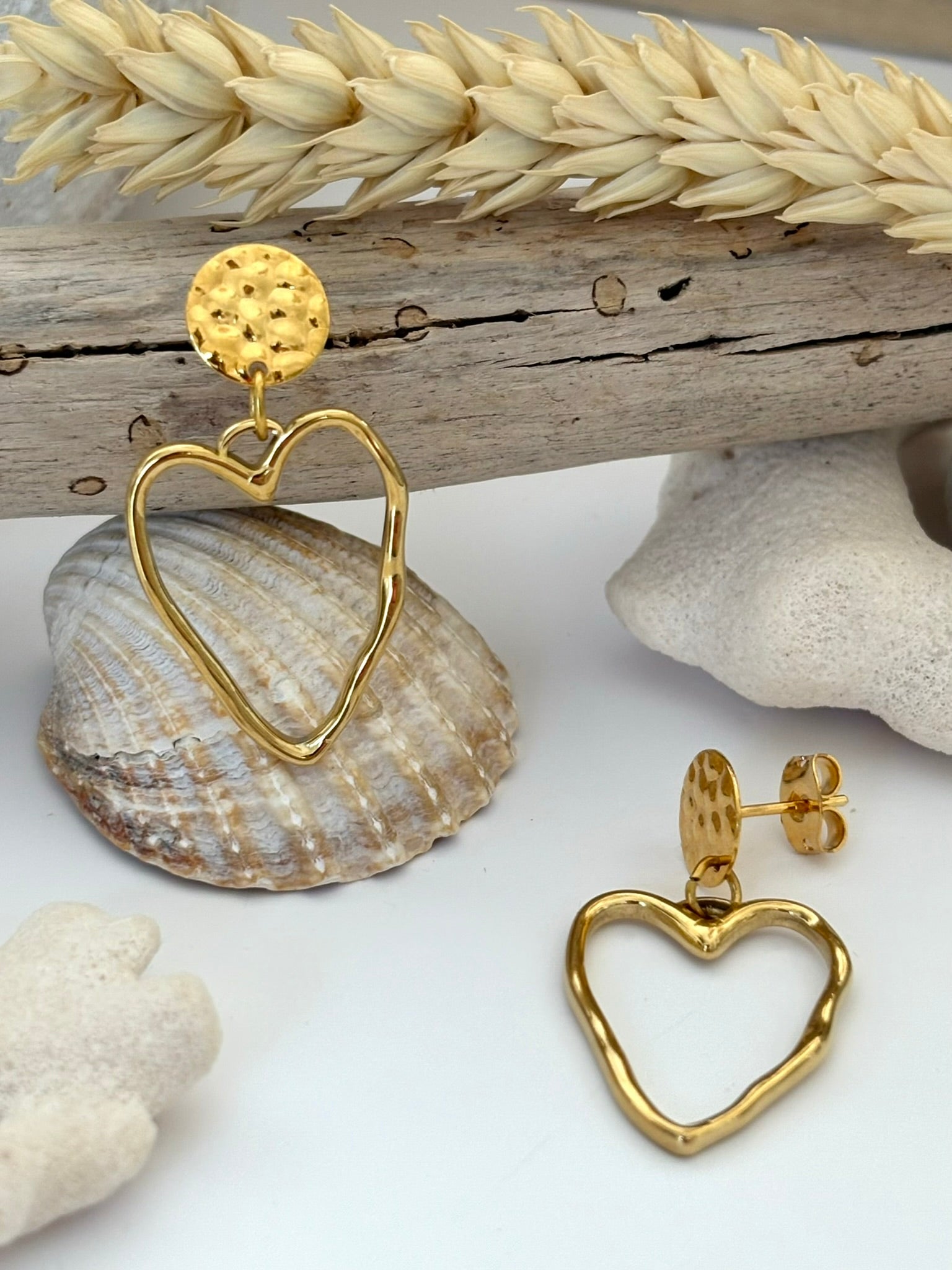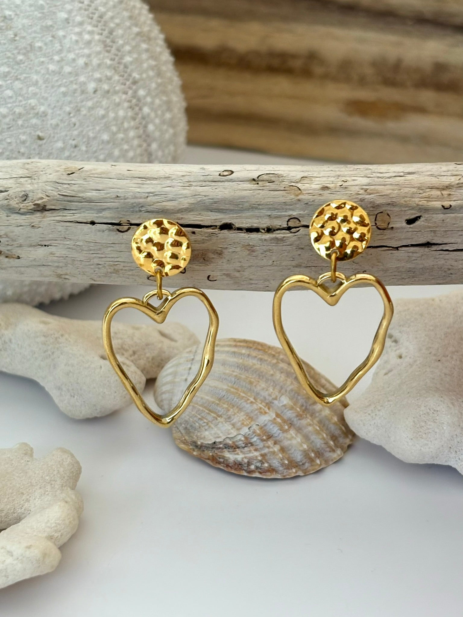 Boucles d'oreilles clou disque martelé acier inoxydable , pendentif coeur irrégulier en acier