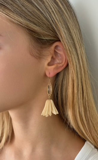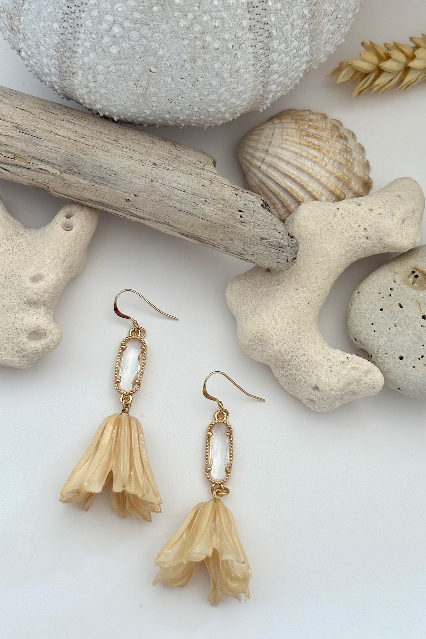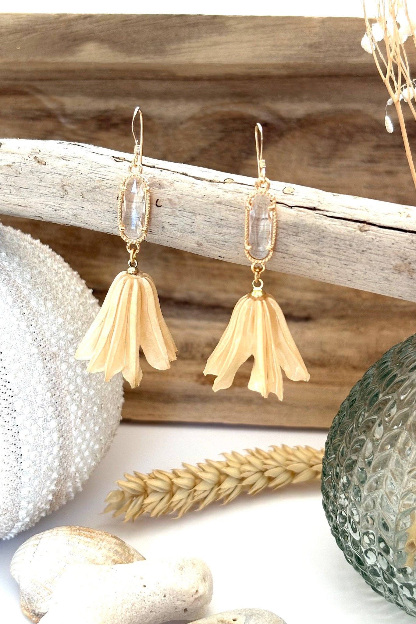 Boucles d'oreilles en crochet Gold Filled , intercalaire laiton avec crystal serti , fleur en pendentif de couleur sable coulée dans la résine