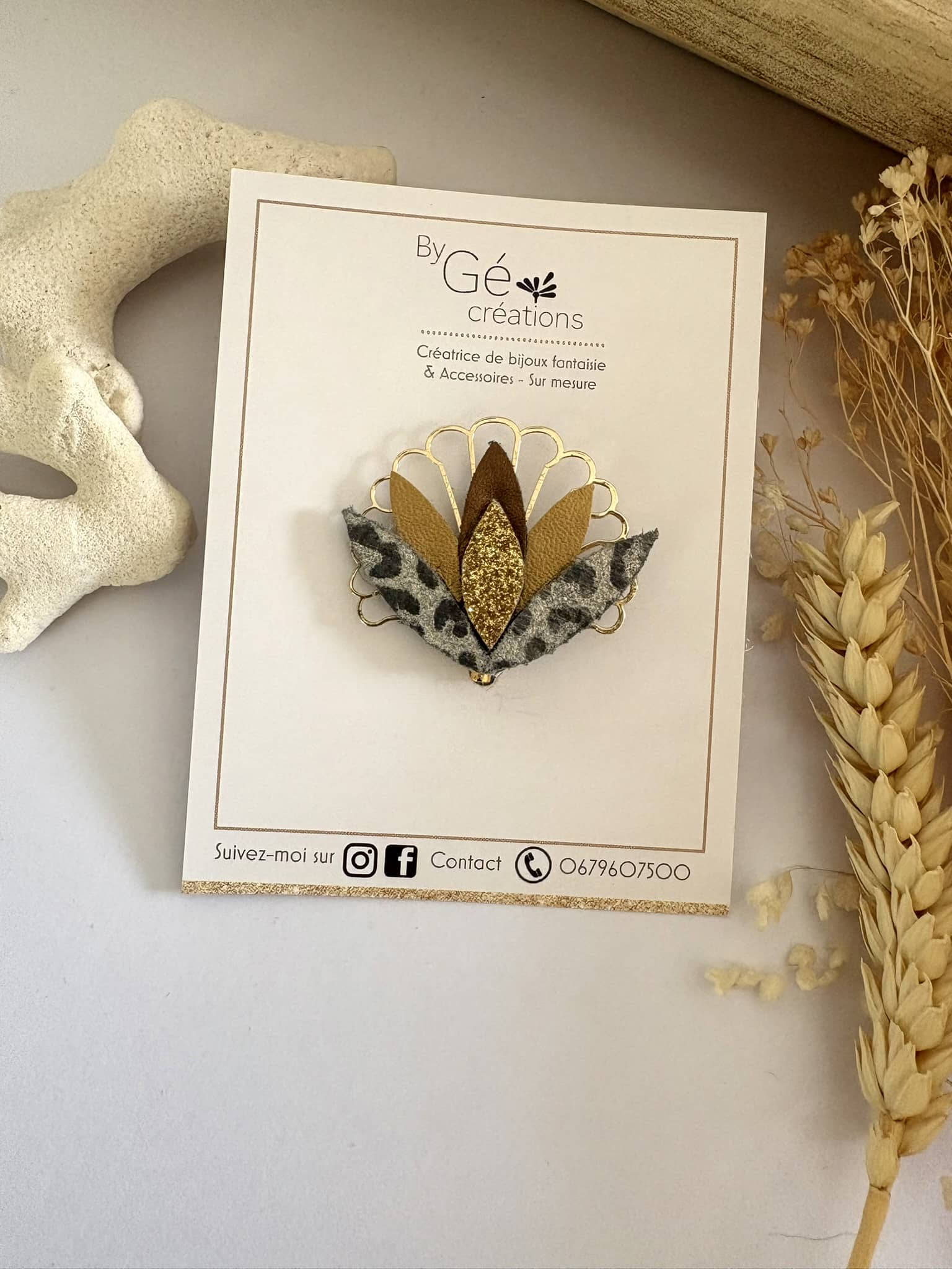 Sur une base acier doré des morceaux de cuir et simili cuir sont disposés en forme de fleur