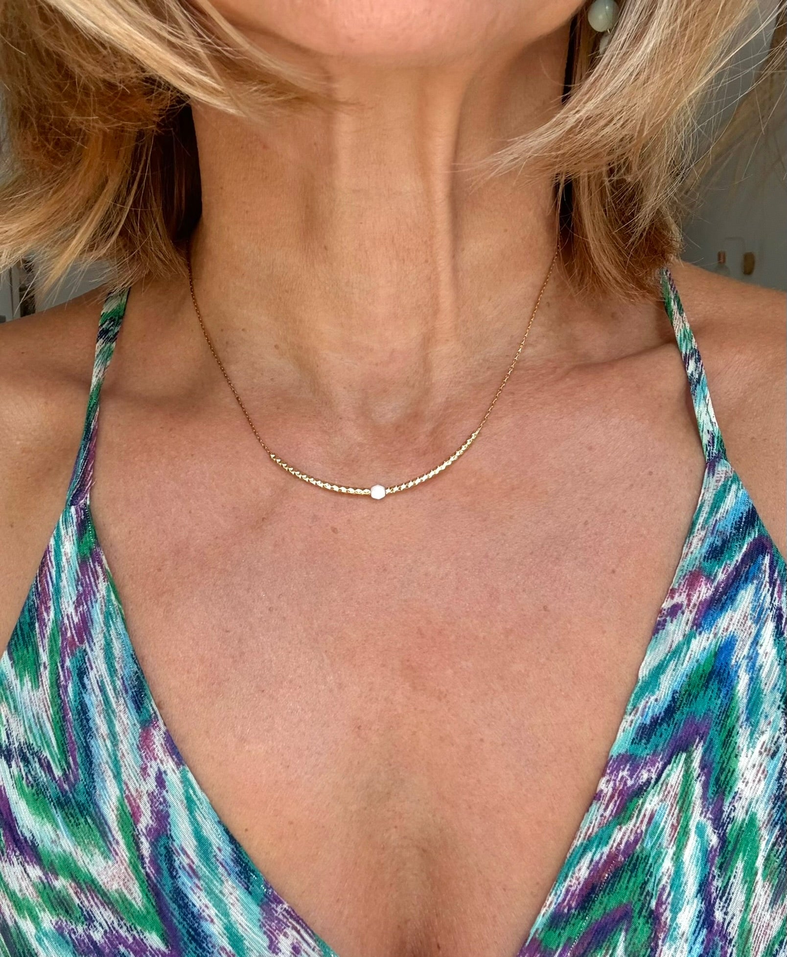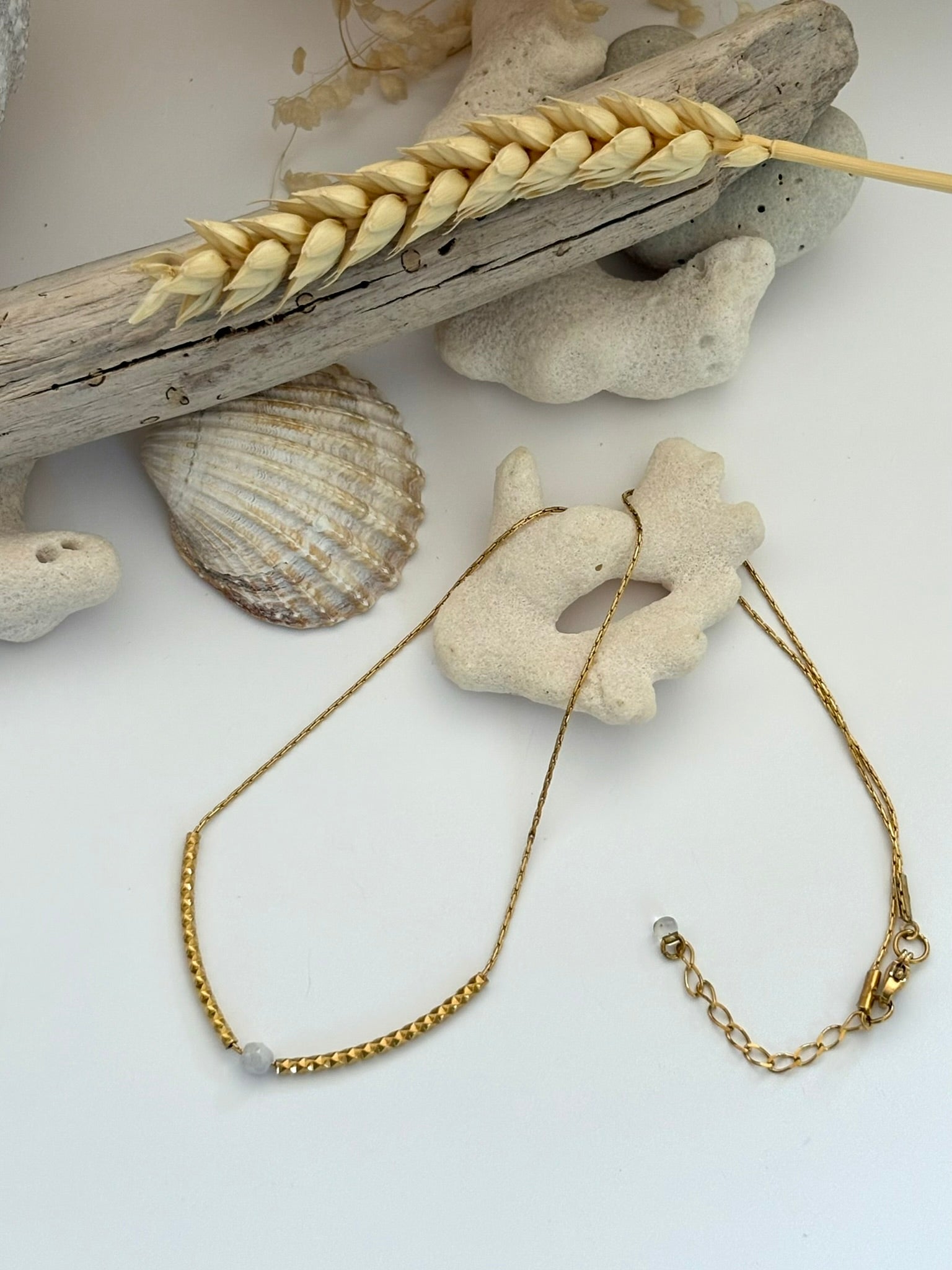 Collier chaine fine acier paloma et insert de 2 tubes travaillés et une perles blanche facettée
