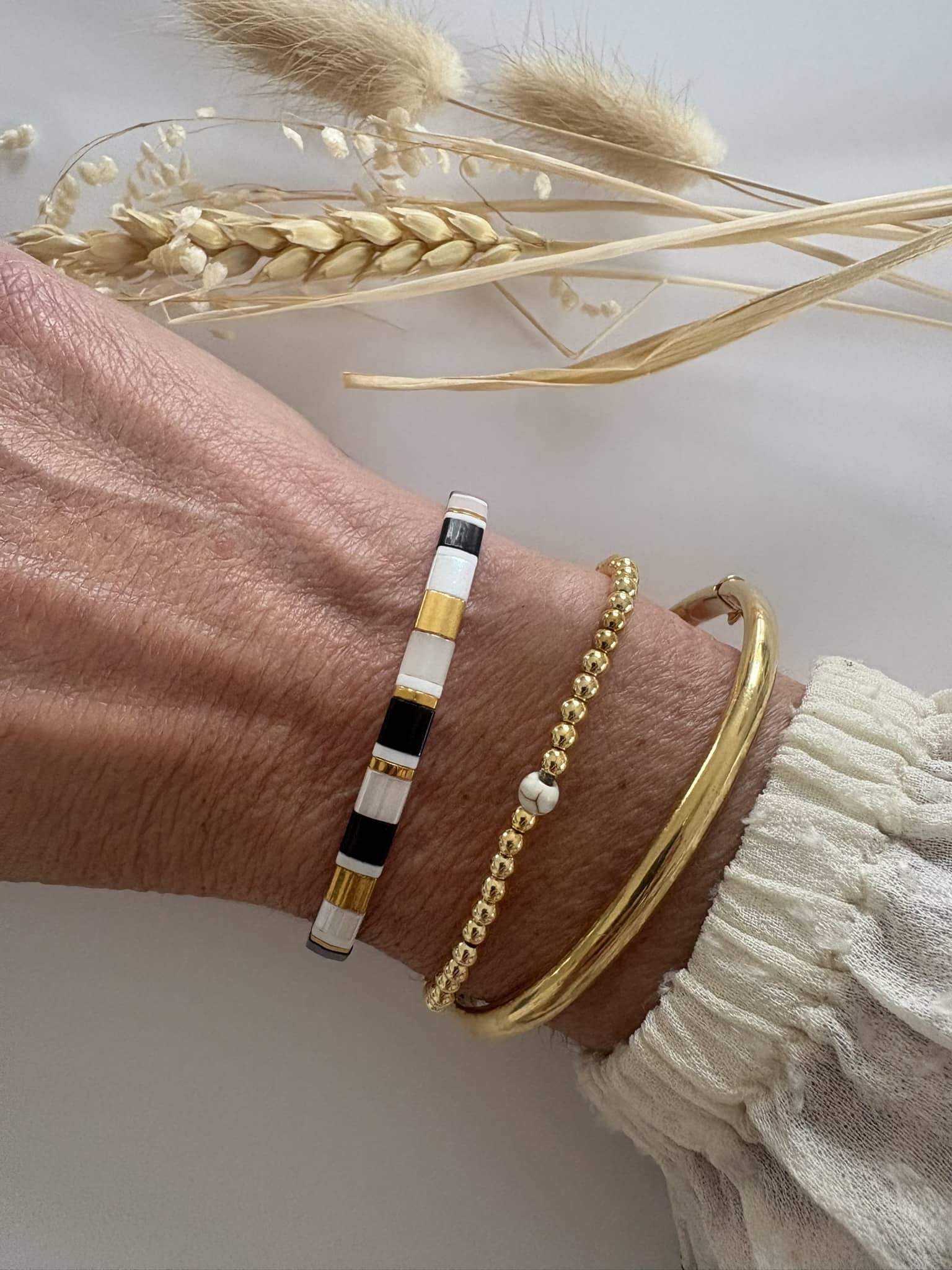 Tons crème, blanc, doré et noir. Des teints sobre et chic à assortir à toutes vos tenues !